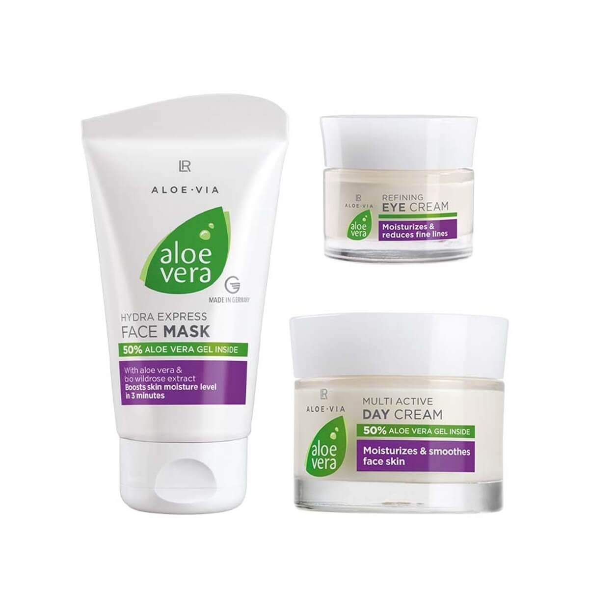 Consigue tu Set de Cuidado Intensivo para una piel bella y radiante. Con 50% Gel de Aloe Vera y extracto de Oliva. La crema de día con aloe vera garantiza una piel del rostro suave, la crema para el contorno de ojos que refina la piel hace que el área de los ojos luzca fresca y tonificada. Y para un aumento extra de hidratación, ¡la mascarilla facial de aloe vera!